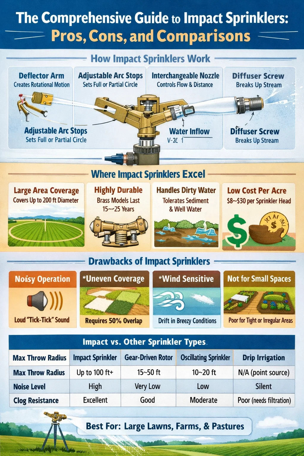 Impact sprinklers are genuinely good tools that have stood the test of time in irrigation for very good reasons. Their mechanical simplicity, long service life, wide coverage radius, and ability to handle challenging water quality conditions make them the clear best choice for large open-area irrigation — particularly agriculture, ranching, and large residential or commercial properties.
