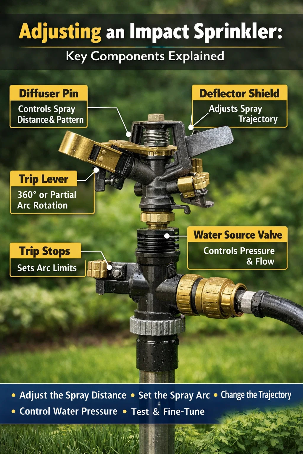 Before making any adjustment to an impact sprinkler, it helps to understand what each component does. Reaching for the wrong part leads to overwatering one corner of the yard while leaving another bone dry. Here's a breakdown of the main adjustable parts found on most standard impact sprinkler heads: