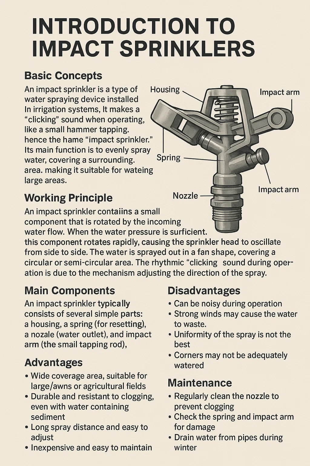 An impact sprinkler is a type of water spraying device installed in irrigation systems. It makes a "clicking" sound when operating, like a small hammer tapping, hence the name "impact sprinkler." Its main function is to evenly spray water, covering a surrounding area, making it suitable for watering large areas.
