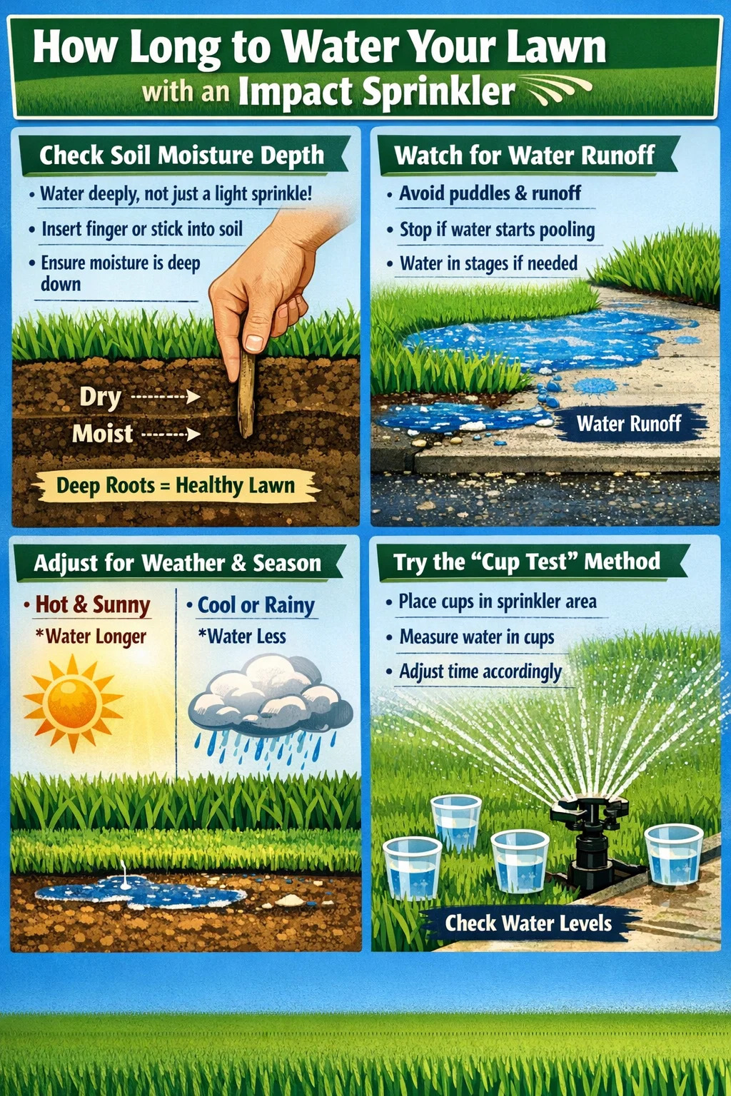 There's no rigid rule for how long to water your lawn with an impact sprinkler, as it depends on your soil type, weather, and grass variety. However, you can determine the appropriate watering time based on a few simple principles.