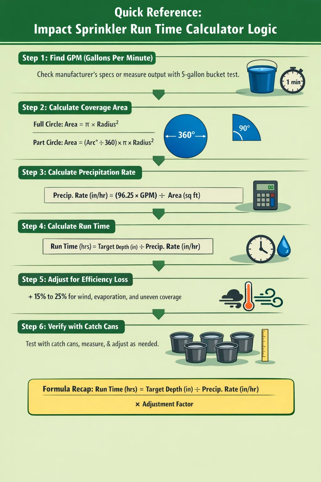 Run Time (hours) = Target Depth (inches) ÷ Precipitation Rate (inches/hour)