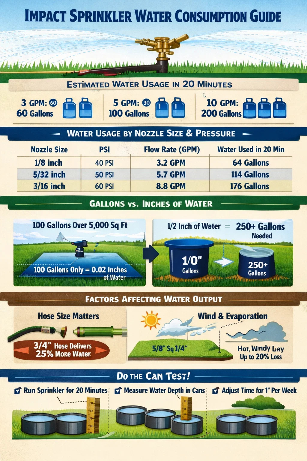 Homeowners rarely care about "gallons" as much as they care about "inches." Most lawns require 1 inch of water per week. An impact sprinkler is highly efficient, but because it covers a large radius, that 20 minutes of watering is spread thin over a large area.